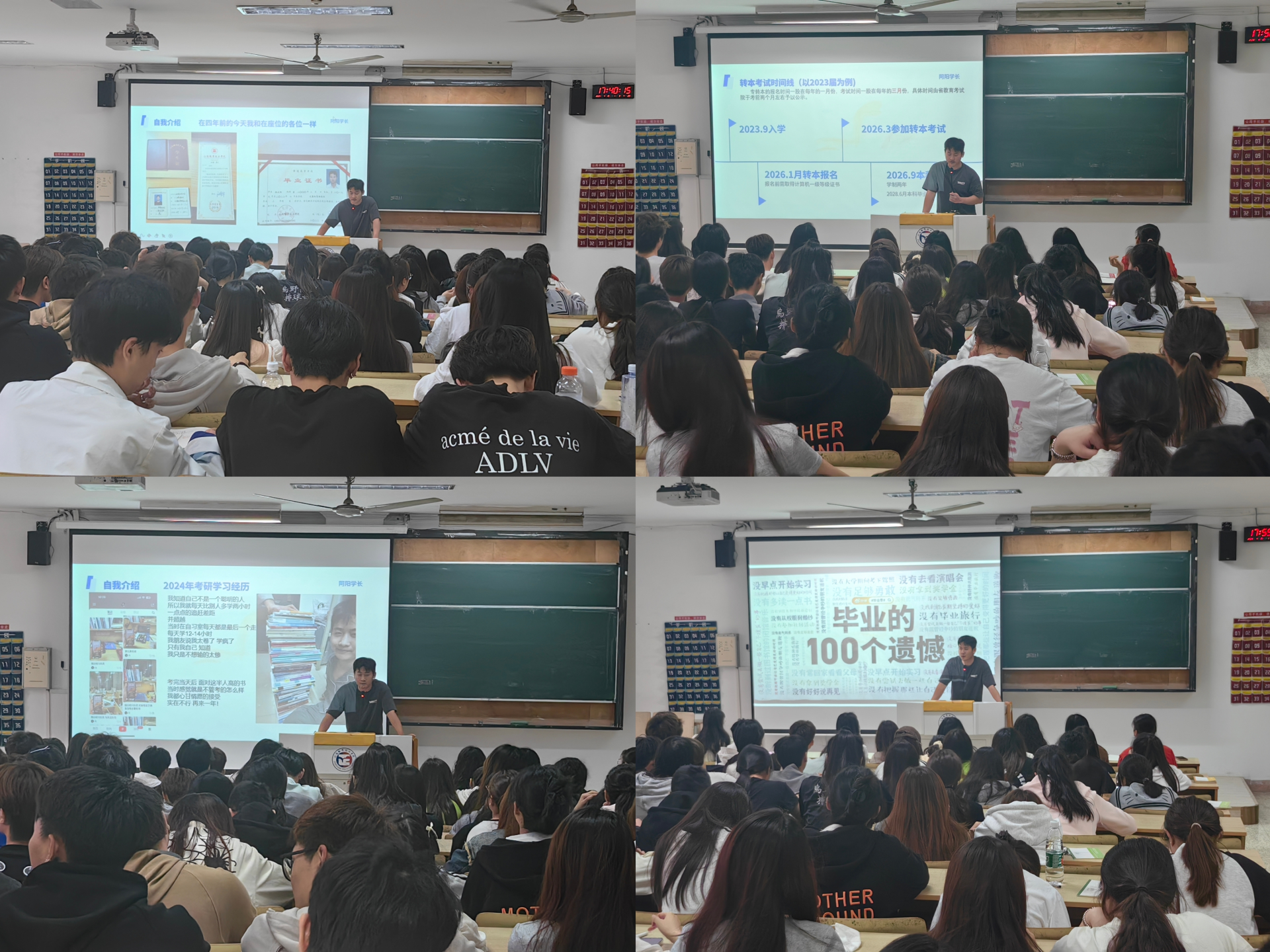 首先,在转本经历方面。他分享不仅需要努力学习、刻苦钻研,还需要给自己制定详细的复习计划,认真严格的执行。尤其是重点课程,同学们应该课前提前预习;上课时,认真听讲,不懂的地方及时向老师请教;课下利用一些手机app,再进一步巩固学习。同时为同学们厘清必考项目及各类考试的时间线,分享了自己进行时间管理的经验。生活方面,他还积极勤工俭学,发现自己的兴趣点,培养沟通技能,积累实践经验。目标总是一步一步的实现的,在设定考研目标后,他对自己有清醒的定位,他说他清楚地知道自己不是聪明的那一个,但一定是努力的那一个,所以无论结果如何他都全力以赴,不留遗憾,这也是他成功的秘诀吧。