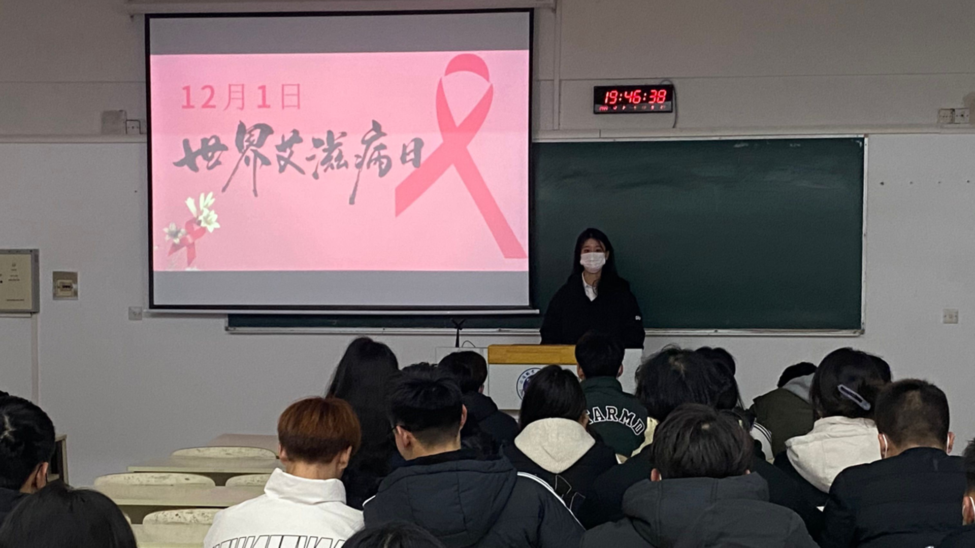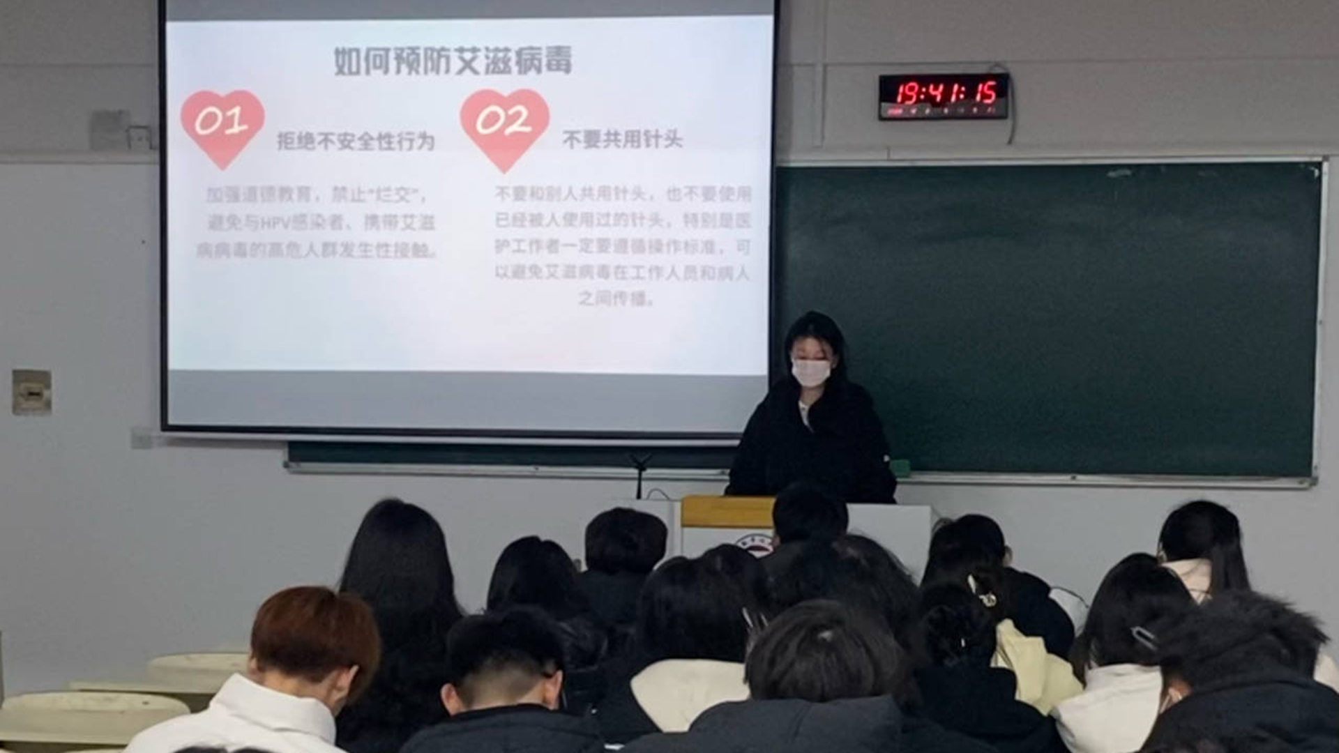 顾秀雨同学紧紧围绕宣传主题,从"什么是艾滋病、艾滋病的传播途径、如何预防艾滋病"三个方面来展开宣讲。以艾滋病的机理和症状描述为切入口,引导同学们深入思考、科普艾滋病的传播途径和预防方法。