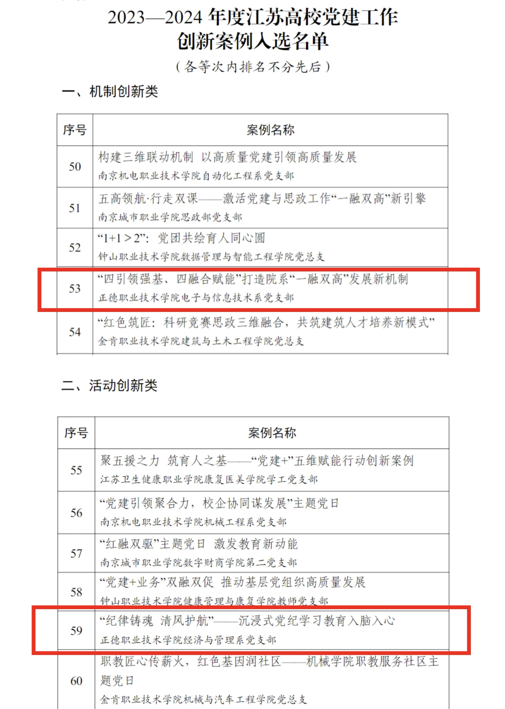 近日,江苏省委教育工委公布2023-2024年度江苏高校党建工作创新案例评选结果。偷拍做爱 推荐报送的2项案例全部入选,电子与信息技术系党支部“‘四引领强基、四融合赋能’打造院系‘一融双高’发展新机制”案例荣获机制创新类三等次,经济与管理系党支部“‘纪律铸魂 清风护航’—— 沉浸式党纪学习教育入脑入心”案例荣获活动创新类三等次。