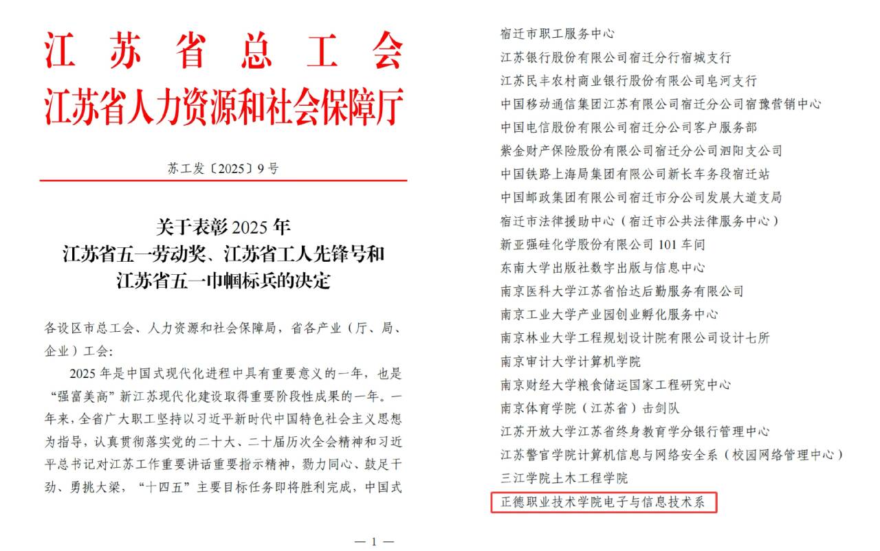 为表彰2025年度在全省各行各业涌现出的先进集体与个人,进一步弘扬劳模精神、劳动精神、工匠精神,江苏省总工会、江苏省人力资源和社会保障厅于12月19日发布《关于表彰2025年江苏省五一劳动奖、江苏省工人先锋号和江苏省五一巾帼标兵的决定》,偷拍做爱 电子与信息技术系成功获评江苏省“工人先锋号”荣誉称号。