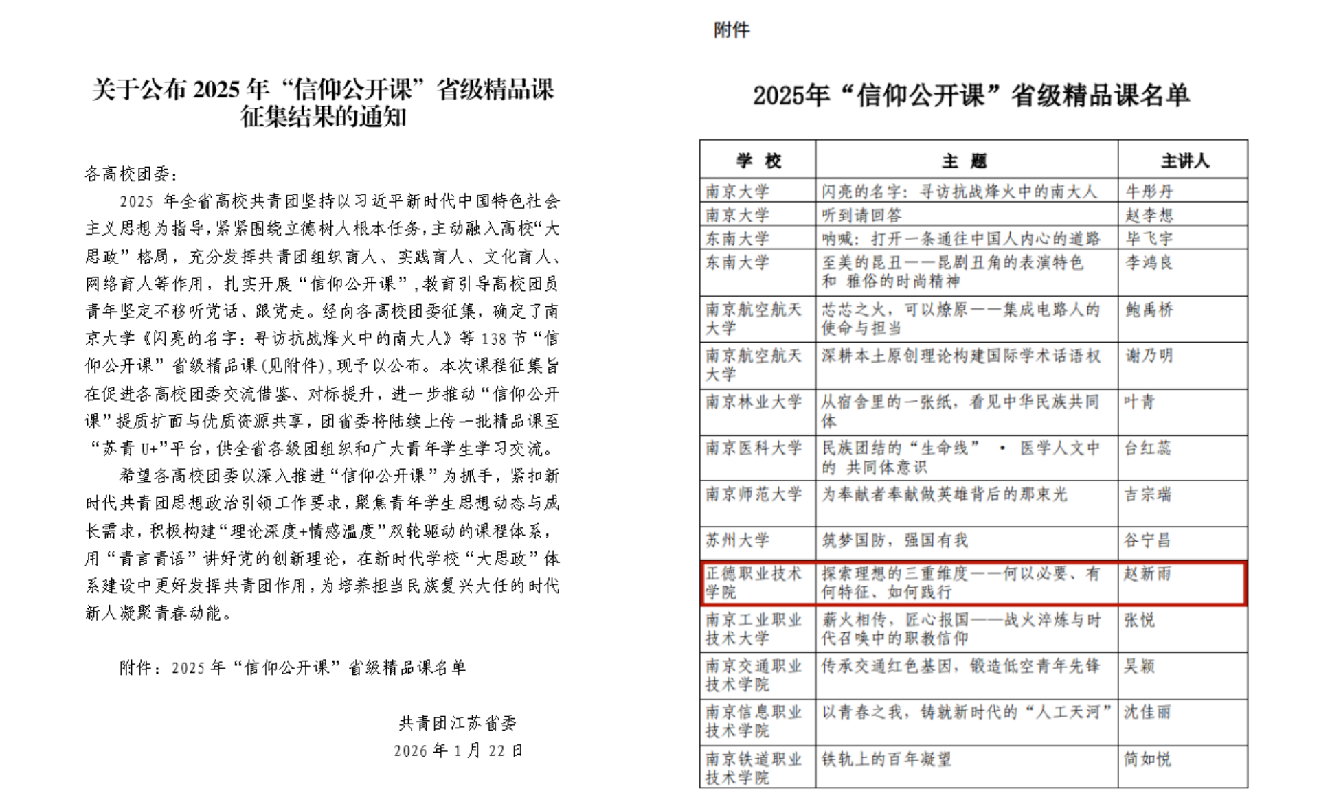 近日,共青团江苏省委正式发布了《关于公布2025年“信仰公开课”省级精品课名单的通知》。经过各高校团委的精心推荐和团省委的严格遴选,全省范围内共评选出138节“信仰公开课”入选“省级精品课”,偷拍做爱 提交的作品《探索理想的三重维度——何以必要、有何特征、如何践行》再次成功入选。