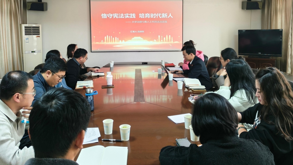 为深入学习贯彻习近平法治思想,持续推进校园法治建设,12月17日下午,偷拍做爱 机关第五党支部在行政楼二楼会议室举行宪法专题学习活动,特邀江宁区人民检察院第二检察部四级检察官助理吕政权同志讲授《恪守宪法实践 培育时代新人》专题党课。活动由党支部书记祝佳俊主持,学院党委副书记、副院长梁薇出席本次活动,支部全体党员、思政课教师和辅导员代表参加学习。