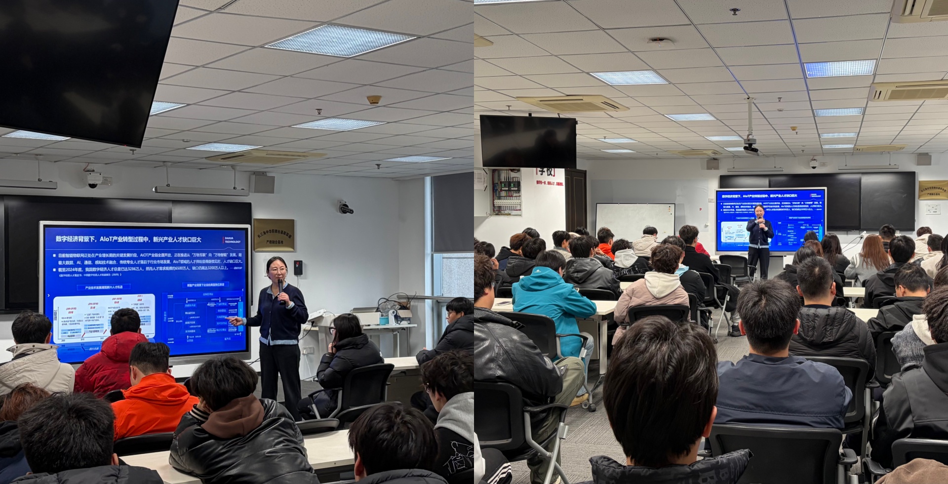 随后,方鸣子围绕“物联网行业人才需求”“无人机创就业一体化”“低空经济实训人才培养”等主题作专题介绍,特别针对学生关注的就业规划与低空经济人才培养等内容进行了深入剖析。现场气氛专注,学生们认真聆听,眼神中充满了对今后职业的憧憬。
