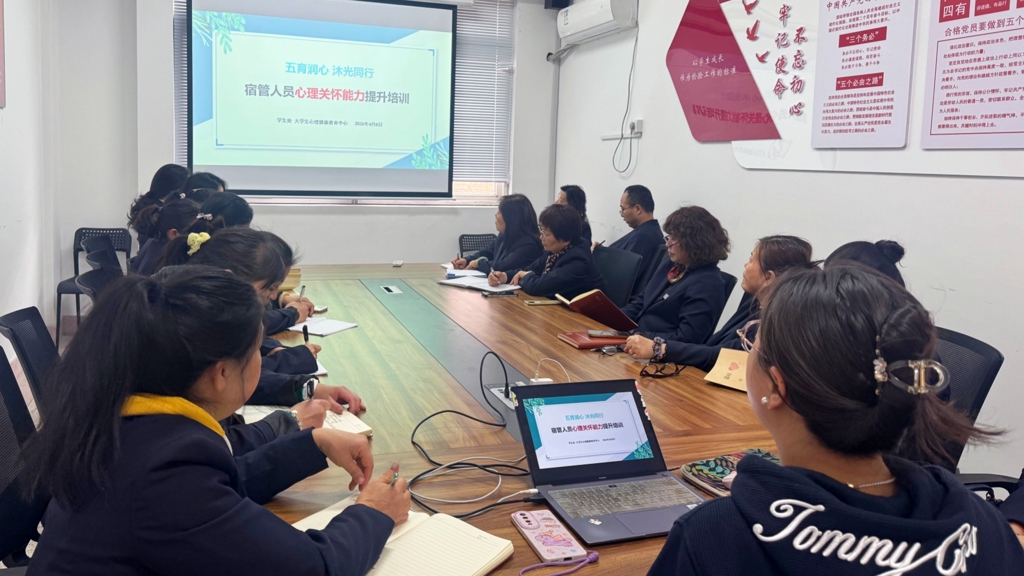 为深入践行“健康第一”教育理念,切实发挥宿管员在学生心理防护网络中的“前哨”作用,4月8日上午,学生处在2207会议室举行“五育润心 沐光同行”宿管员心理关怀能力提升培训。本次培训由心理中心樊荣老师主讲,学生处副处长何华智主持,全体宿管员参会。