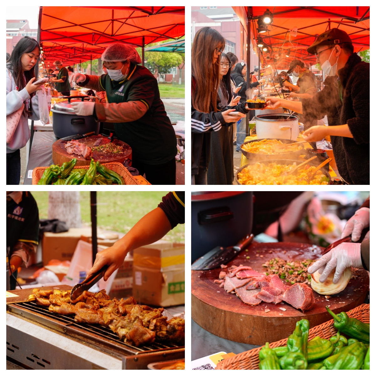 美食节现场香气弥漫、氛围热烈,各摊位前人头攒动、欢声笑语不断。香酥薄脆的脆皮小锅盔、软烂入味的卤猪脚、香气浓郁的现炒大锅爆米花、备受追捧的徐州大肉串,搭配清爽丝滑的酸奶甜品,各式美食各具风味、鲜香诱人,引得师生纷纷驻足品尝、打卡点赞,好评如潮。