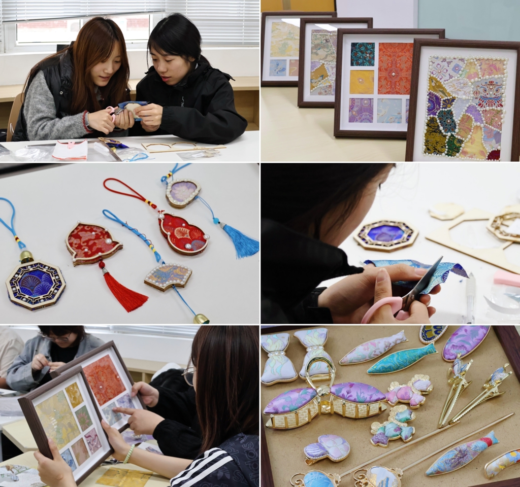 在宋锦手工体验环节,基础教育系教师单士琦、吴美仪指导学生进行纹样涂色、珍珠粘贴、宋锦挂饰制作。同学们以生成的AI宋锦纹样为蓝本,经过涂色、裁剪、粘贴还原宋锦的色彩韵味。本次活动能亲眼见证宋锦之美、亲手完成手工的制作,体验感全面提升,对非遗文化有了更真切的认知。
